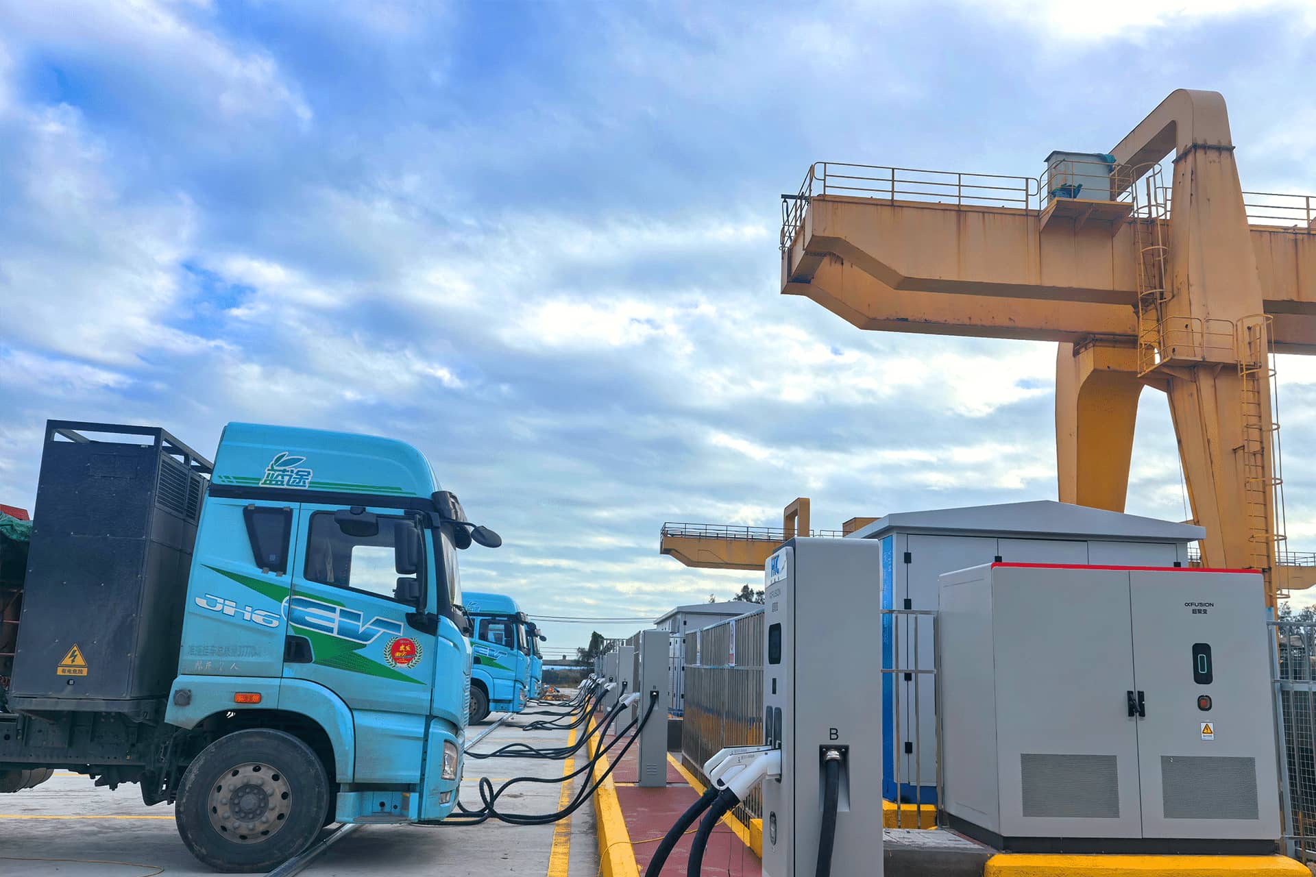 示范站现场配置6台超聚变800KW分体式智能直流充电主机及31台超(快)充终端,依托超聚变核心功率魔方技术,实现模块化并柜扩容,可灵活组建兆瓦级充电功率池,从容应对大规模重卡集群的高效补能及未来扩容需求,充分保护用户投资。