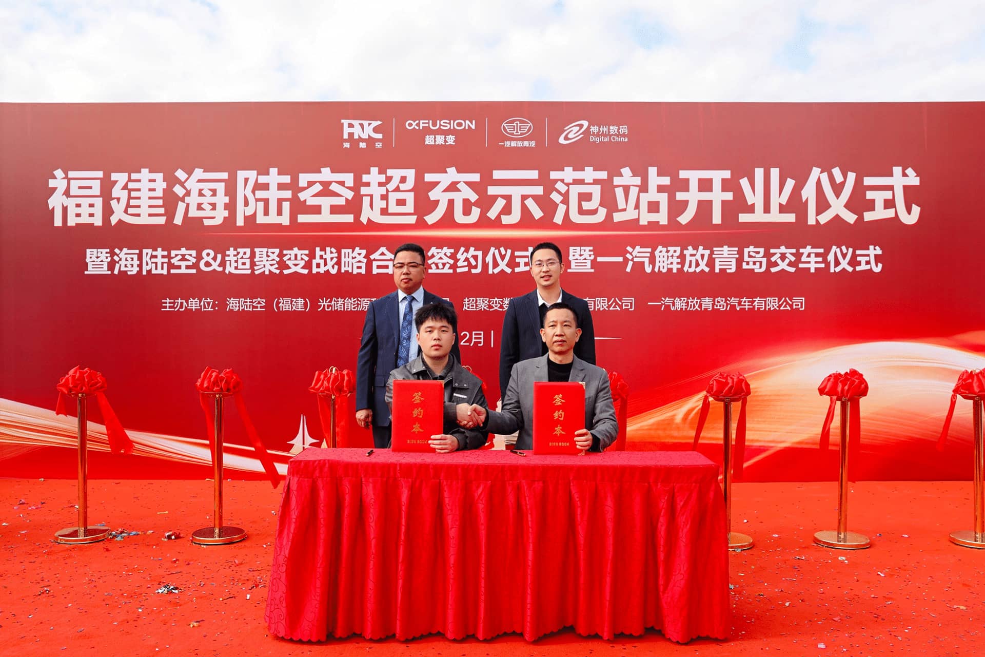 活动现场,超聚变与海陆空(福建)光储能源科技有限公司正式签署战略合作协议,并共同为示范站揭牌剪彩。双方将依托超聚变在液冷技术、智能运维等领域的技术积累,结合海陆空公司在商用车运营场景的资源优势,构建“技术研发-场景应用-市场推广”的完整生态链。