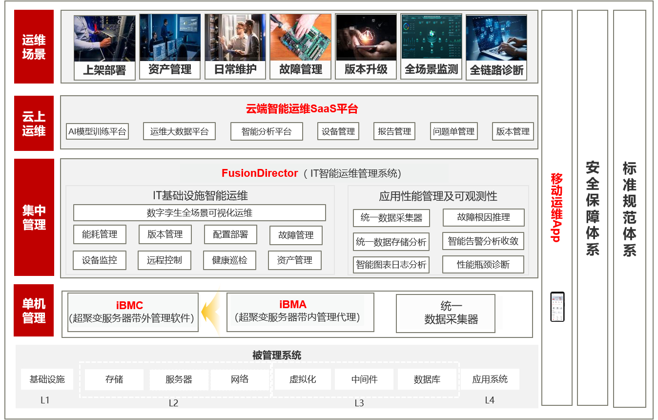 FusionDirector 25.0 持续强化开放集成能力,支持 Redfish 标准接口,可轻松对接各类云平台、运维系统与第三方工具,可灵活服务于公有云、私有云、AI计算、边缘节点等多样化场景。帮助金融、电信、互联网及政企行业快速部署,构建统一、敏捷、智能的运维中台。