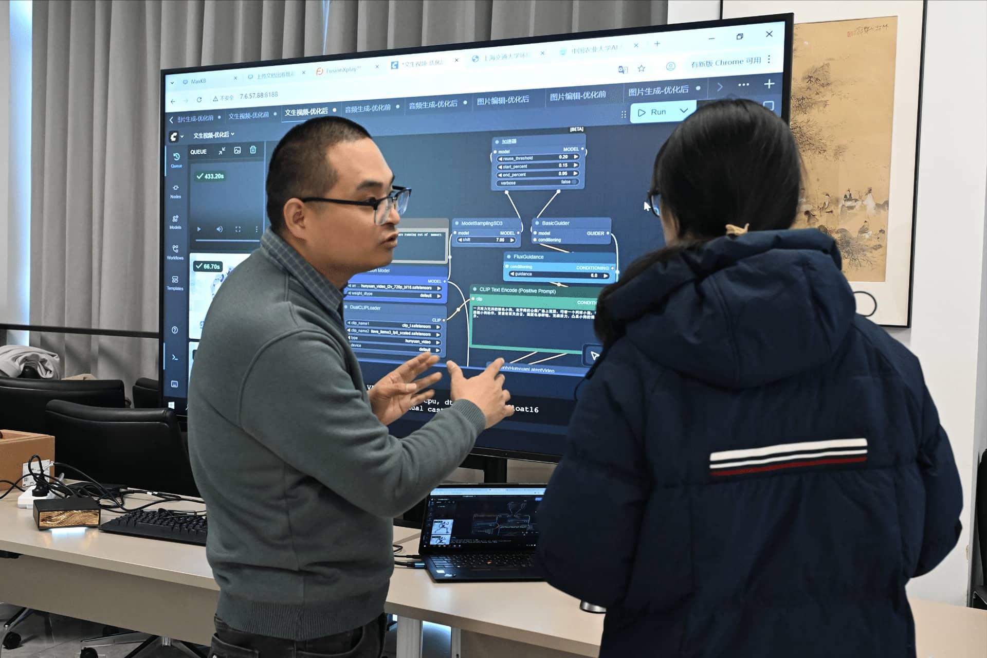 FusionXpark™真机体验环节,超聚变FusionOne AI解决方案架构师陈琪为在场师生与行业嘉宾直观展现FusionXpark™在智能影像创作中的操作流程、核心功能与运行效果。现场来宾积极参与互动体验,围绕技术细节、教学实践以及未来产学研合作模式展开热烈交流,沉浸式体验与浓厚的创新氛围,进一步推动艺术创作与智能技术的融合。