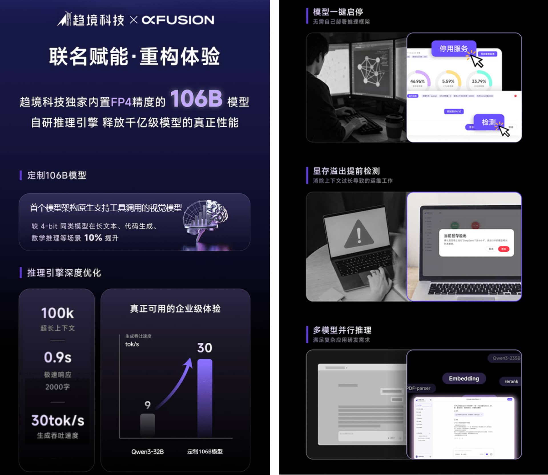 产品搭载趋境科技全球首创的“全系统异构协同推理”与“以存换算”核心技术,联合KTransformers推理引擎与Mooncake分布式推理框架,将大模型本地部署门槛降低10倍。四大核心能力重塑AI开发体验: