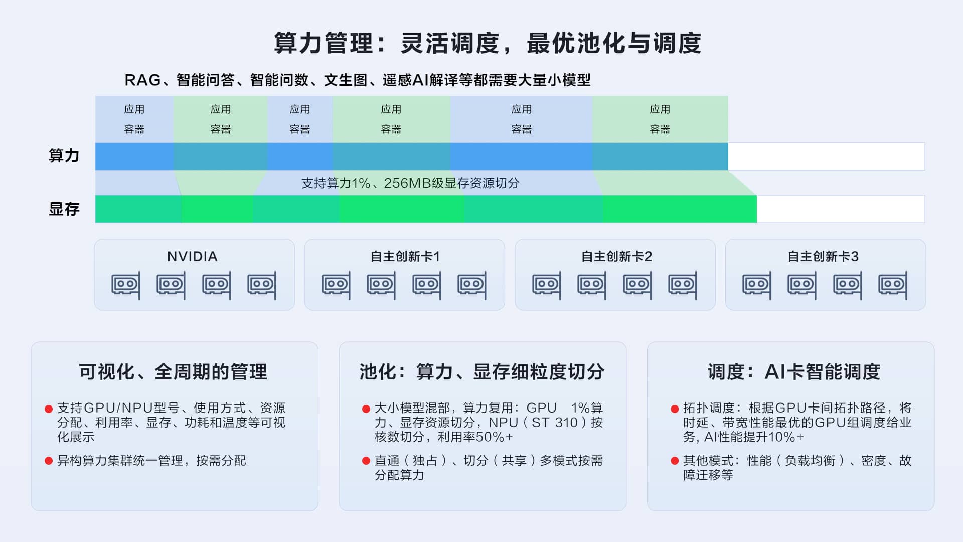 ● 软硬一体化的算力、模型管理措施:AI资源可视化管理,高效算力池化调度,提供模型微调能力,算力吞吐较开源方案最高提升145%;