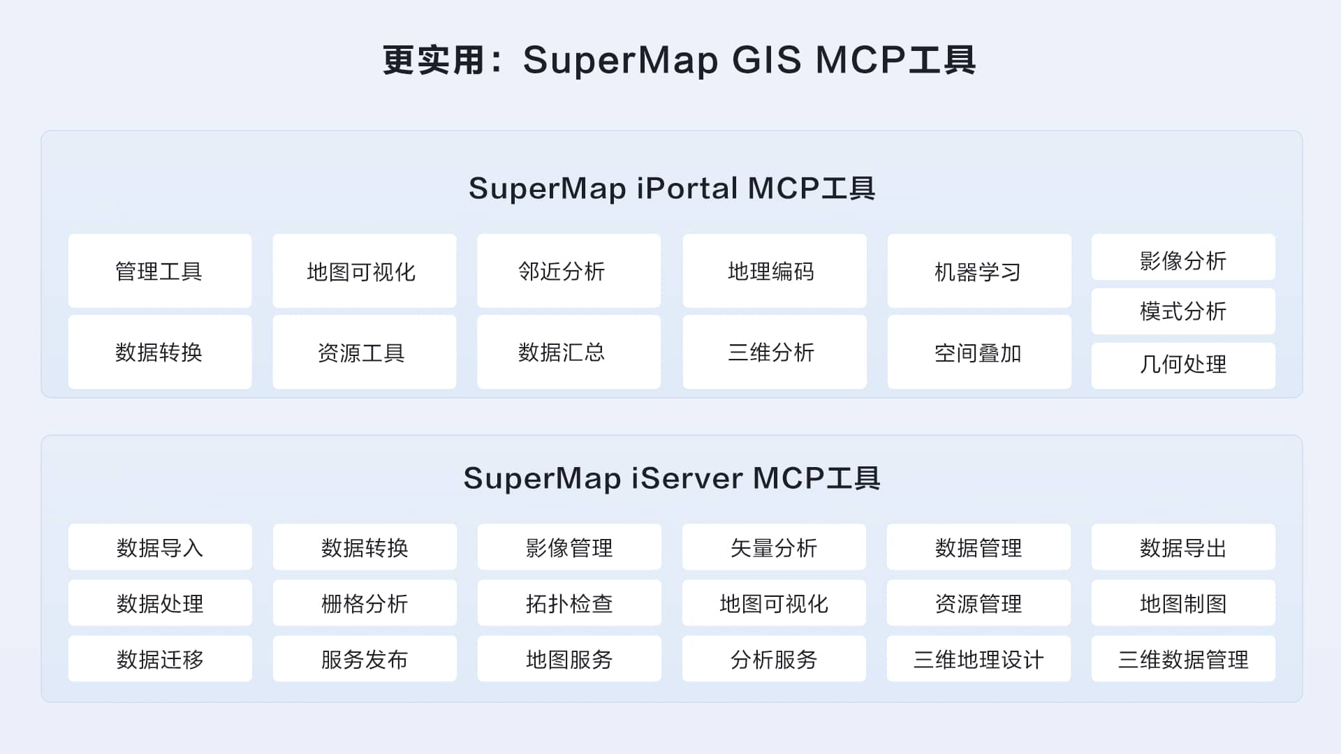解决方案不仅内置超图SuperMap iServer、SuperMap iPortal等GIS专属MCP工具,还支持对接高德、百度等第三方MCP服务,实现跨平台能力拓展,打破数据与工具壁垒。