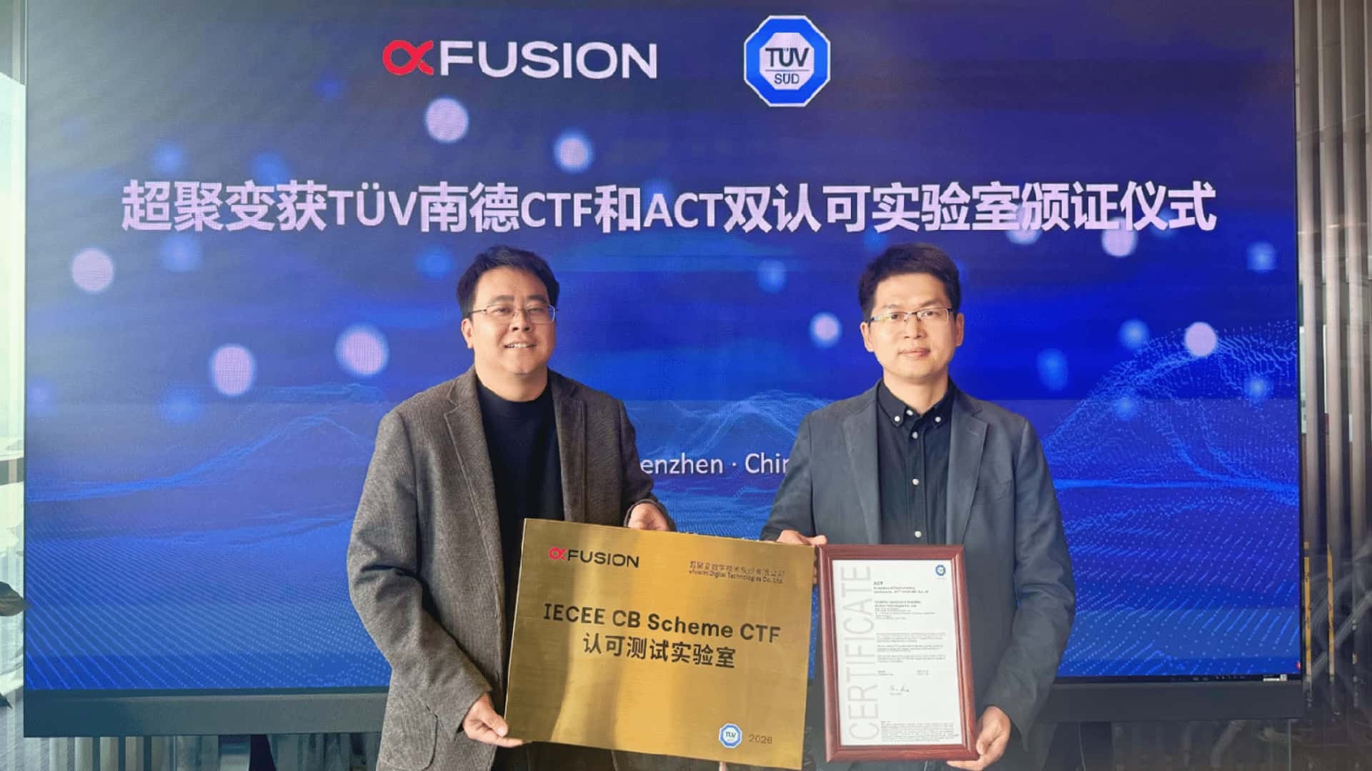 近日,超聚变可靠性实验室获TÜV南德意志集团(以下简称“TÜV南德”)颁发的CTF 与ACT双认可实验室证书,表明实验室在检测设备配置、人员资质、管理体系运行等方面,符合IEC国际电工委员会及TÜV南德的相关要求。超聚变可靠性实验室负责人晏君、TÜV南德代表张海权等嘉宾出席颁证仪式。