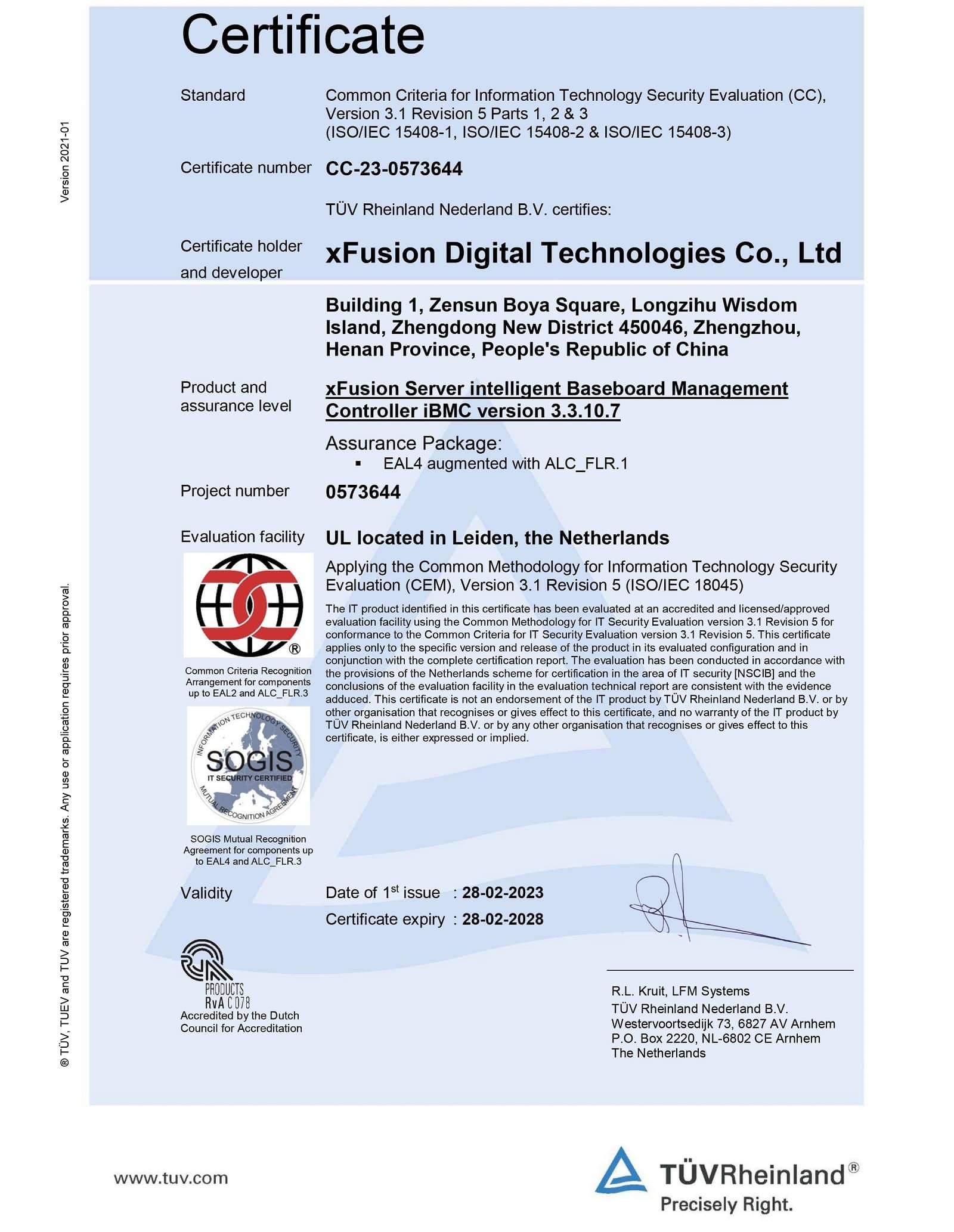 Intelligent Baseboard Management Controller (iBMC) is an embedded server management system used to manage servers throughout their lifecycle. It provides a series of management tools for hardware status monitoring, deployment, energy saving, and security, and offers standard interfaces to build a complete server management ecosystem. The CC EAL4+ certification proves that the iBMC has the world-leading security capability, and is able to provide secure and reliable server lifecycle management services for enterprises.